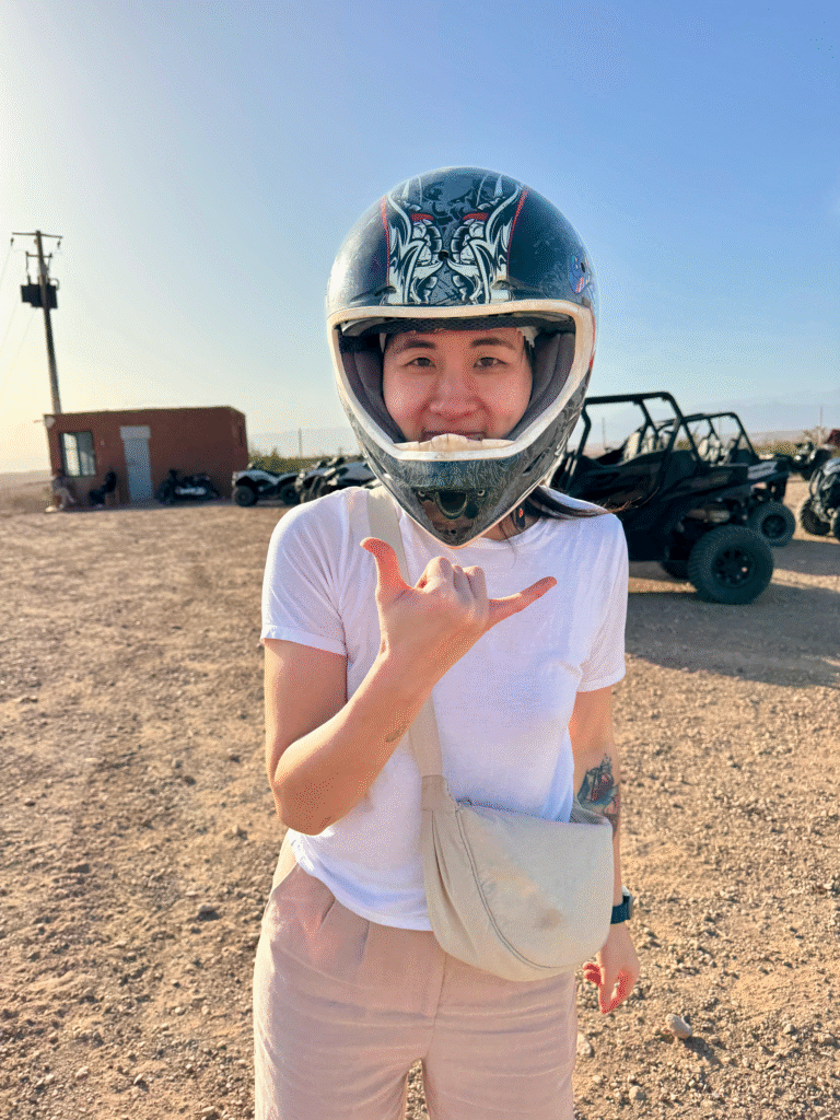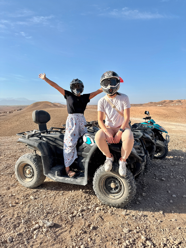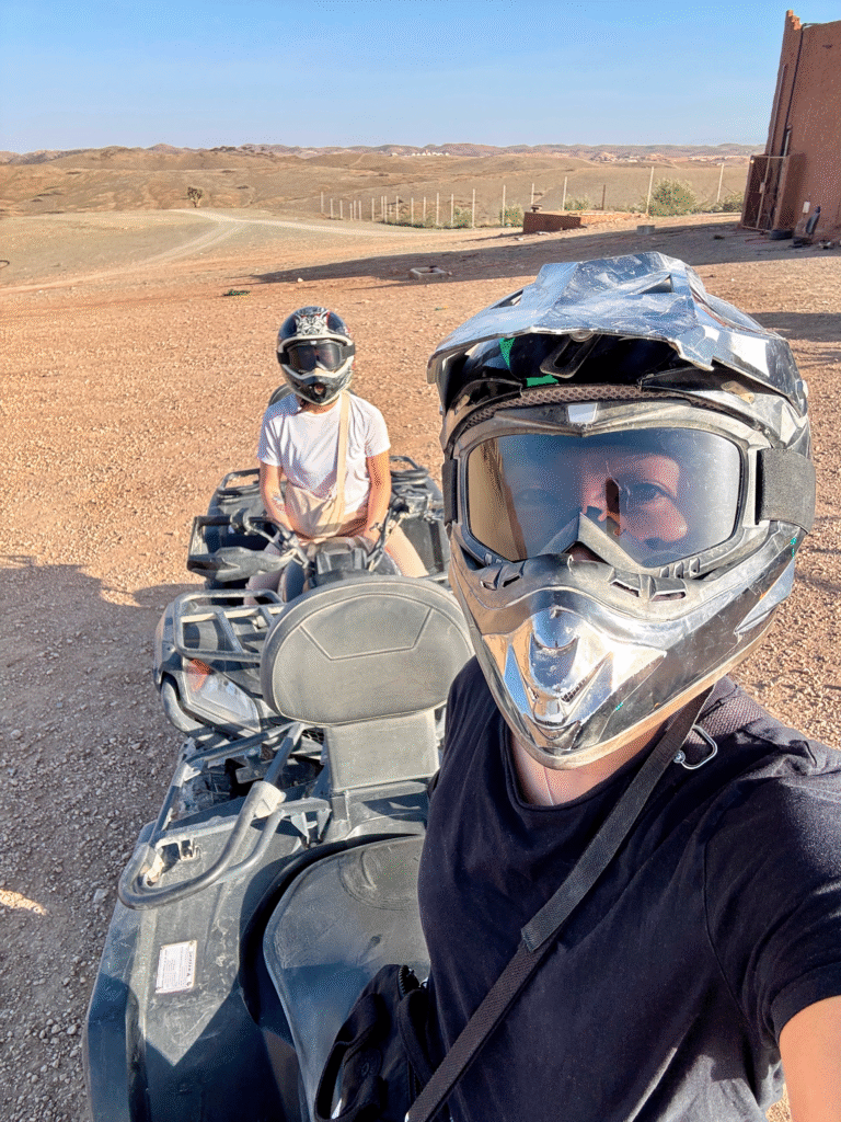 The next morning, we woke up early for a short ATV ride through the dunes, stopping midway for a quick Moroccan tea break in the middle of the desert. It was such a simple yet unforgettable moment, the perfect way to wrap up our Agafay Desert stay before heading back to Marrakech.