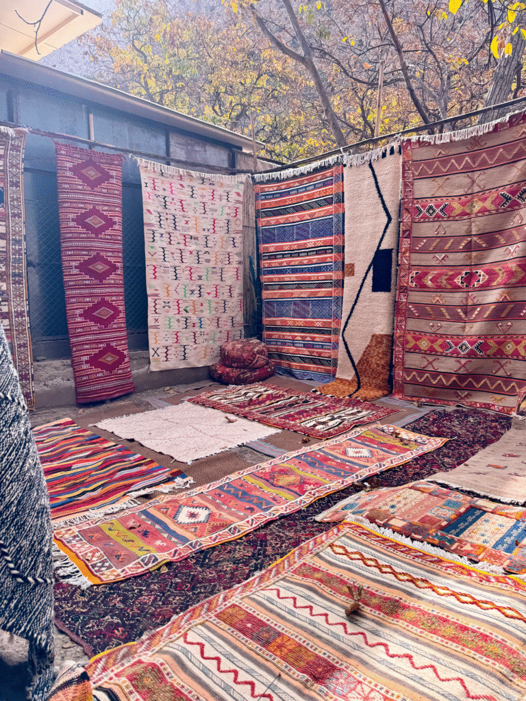 When we reached the valley, we opted for the hike up the Atlas Mountains, which turned out to be absolutely beautiful but more challenging than expected! It’s a medium-level hike, so make sure to wear comfortable shoes and bring a small bottle of water. Along the trail, we passed local stalls selling handmade rugs, jewellery, and souvenirs before reaching viewpoints overlooking the valley.