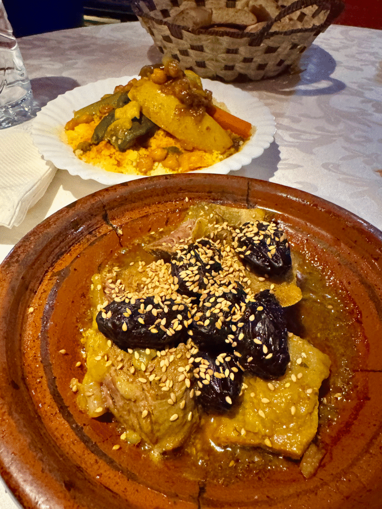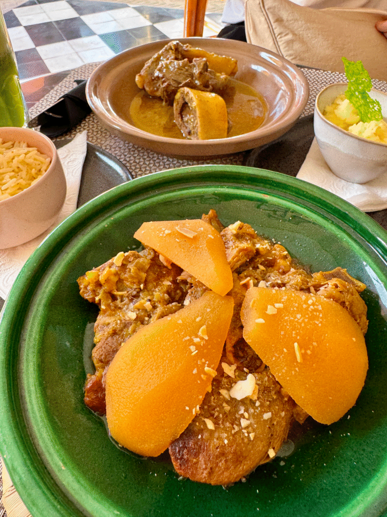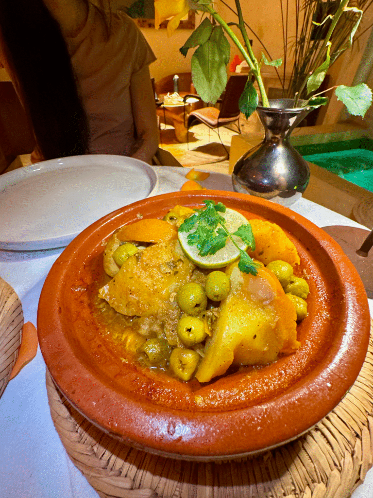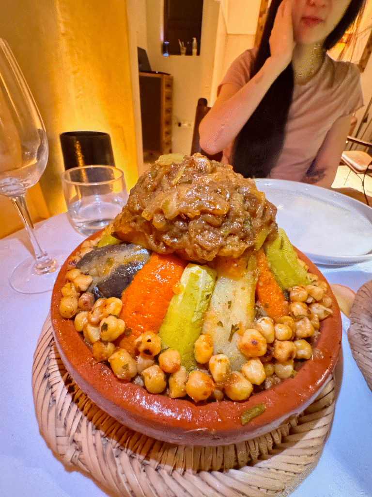 After exploring, we strolled around the nearby area filled with small boutiques, cafés, and art shops. We ended up dining at Le Majorelle Rooftop & Concept Store, where we had our first Moroccan meal overlooking the streets below, fresh tagine, couscous, and mint tea. This meal cost 515 Moroccan Dirhams (MAD), which is approximately £42 in British Pounds (GBP)