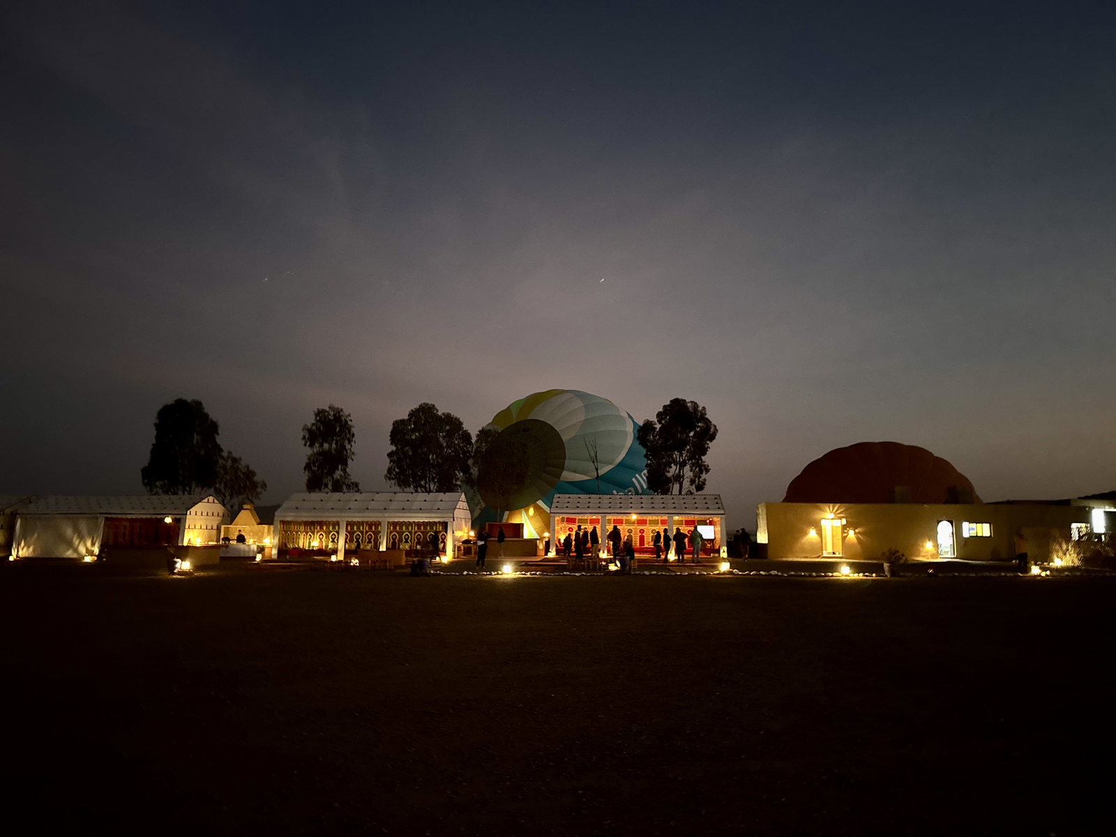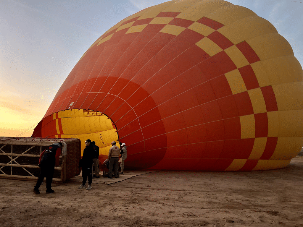 Our adventure started bright and early with a 4:30 AM pick-up for our hot air balloon experience over the Agafay Desert. When we arrived at the launch site, we were welcomed into large Bedouin-style tents for a short briefing with complimentary drinks. It was still chilly before sunrise, but they thoughtfully provided blankets to keep everyone warm.