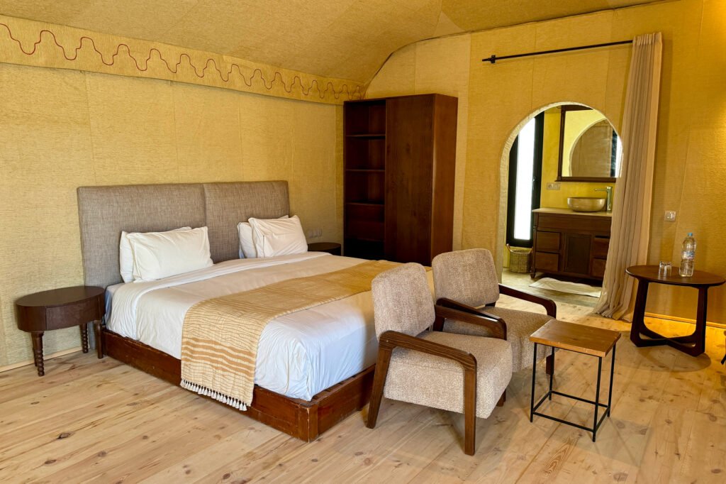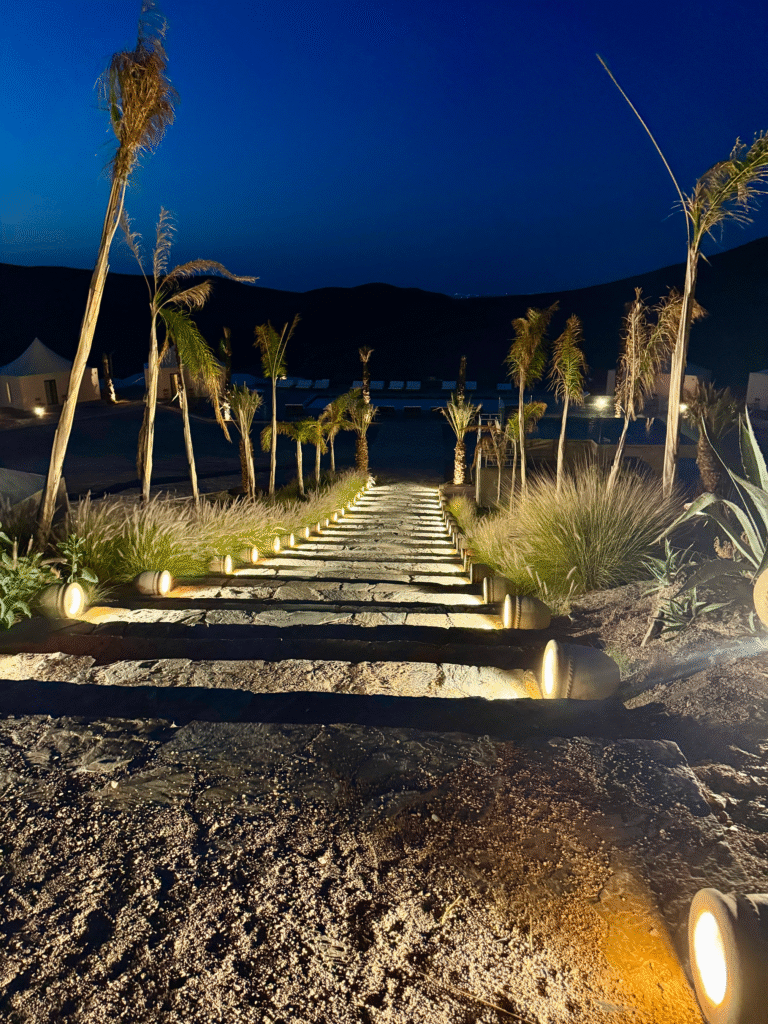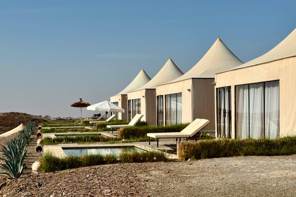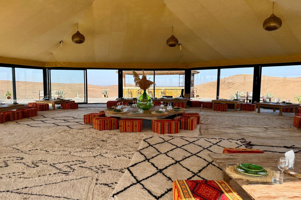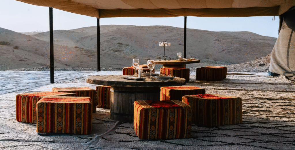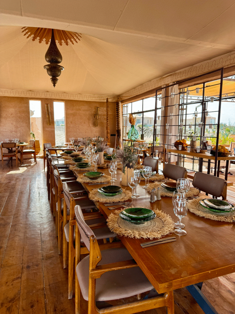 By late morning, we made our way back out to the Agafay Desert, where we checked into White Camel Lodge, a beautiful glamping-style camp surrounded by rocky dunes and golden desert views. The setting felt both luxurious and peaceful, with stylish tents, open-air lounges, and panoramic views stretching across the desert.