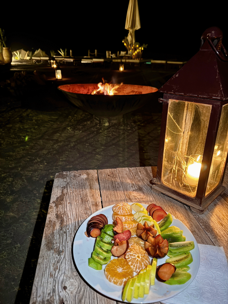 For dessert, we went for something simple — a plate of fresh fruit — and asked if we could enjoy it by the fire pit under the stars. It was such a relaxing way to end the night.