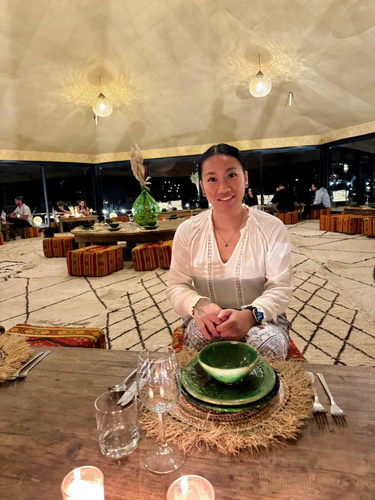 As night fell, we gathered under the stars for dinner and live music. The vibe was warm and intimate with soft Moroccan tunes in the background, and a cool desert breeze all around. We were served traditional dishes like tagine, but after a few days of tagine and couscous, I opted for a wrap and chips and it hit the spot!